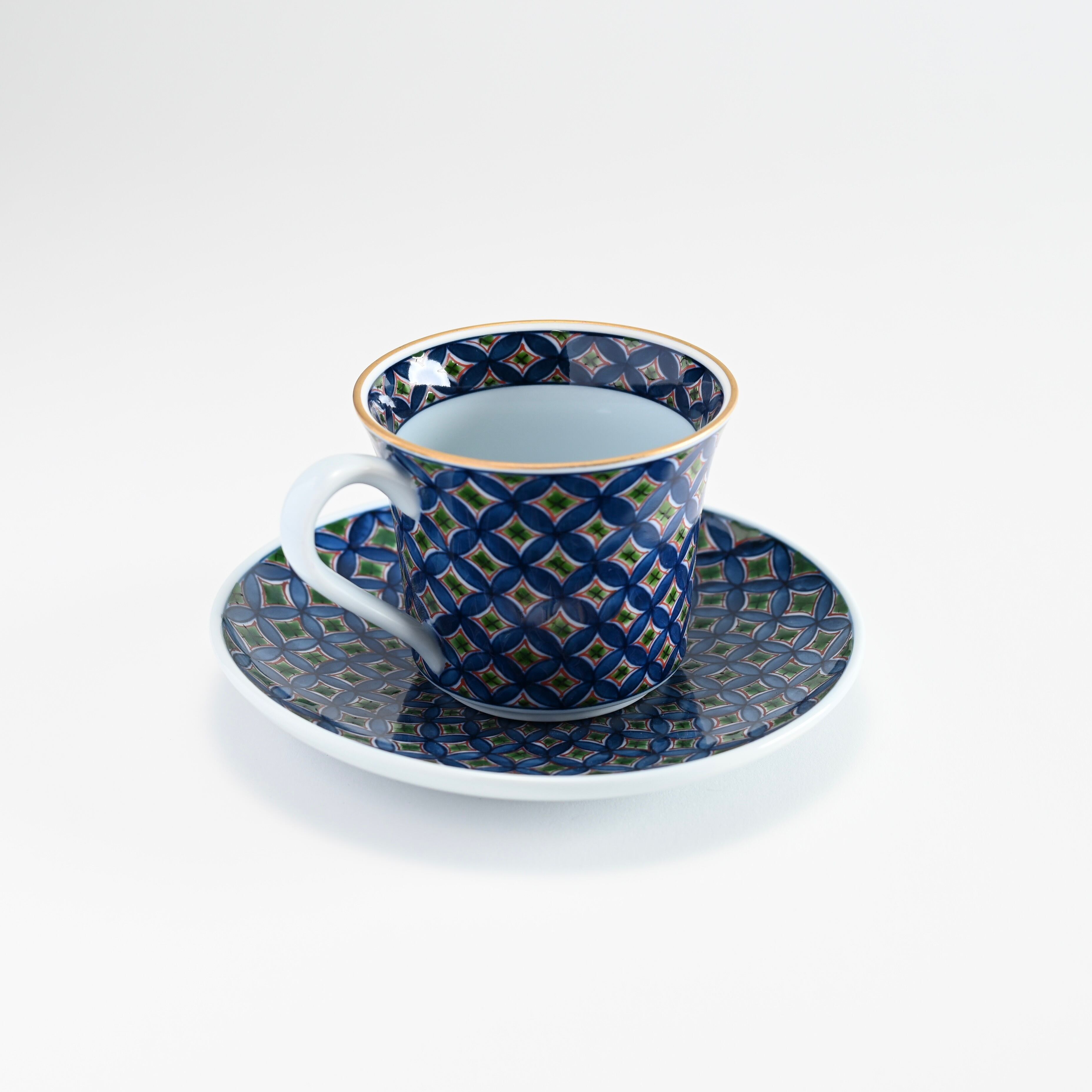 緑彩七宝コーヒーカップは、深い緑色に繊細な七宝模様が描かれた、日本の伝統的な技法による魅力的なアイテムです。内側に染付の円満調和などの願いを込められた七宝模様を1段、表には染付の4段の七宝模様に緑彩で濃みを施しています。その美しいデザインが、コーヒータイムを格別なひとときに演出します。このカップは、自宅のテーブルを上品に彩るだけでなく、大切な方への贈り物としても喜ばれる存在です。手作業で丁寧に仕上げられており、各カップには独自の魅力がある特別な存在です。